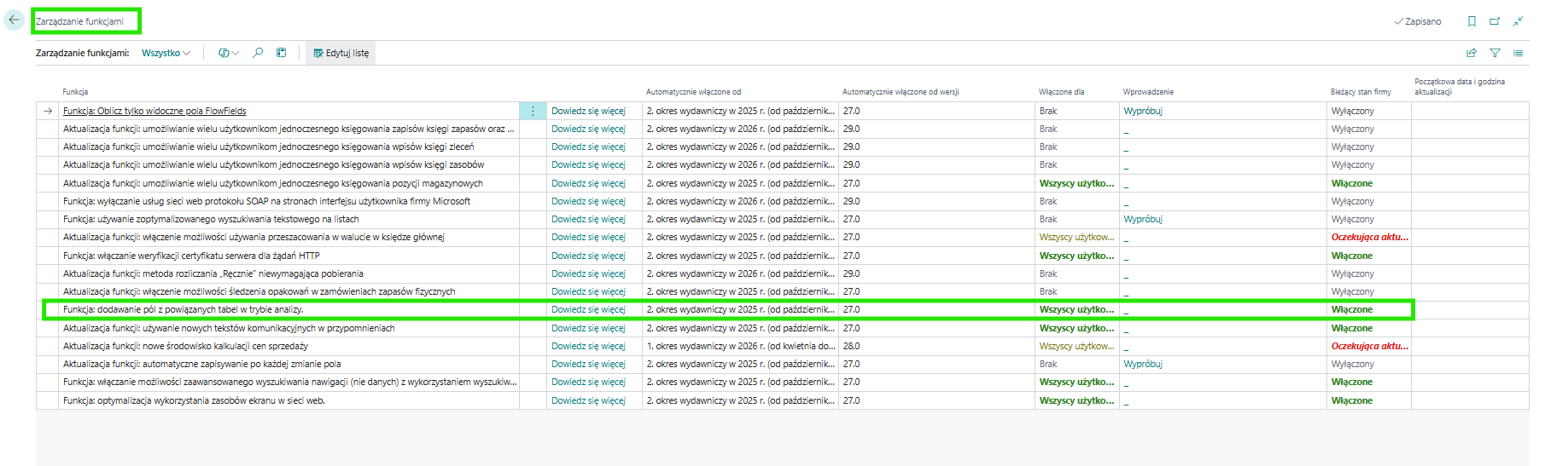 Aby upewnić się, że funkcjonalność jest uruchomiona, należy przejść do strony Zarządzanie funkcjami i wyszukać pozycję: „Dodawanie pól z powiązanych tabel w trybie analizy”. Obecnie opcja ta nie jest aktywowana automatycznie – trzeba ją włączyć samodzielnie. Od wersji 27 będzie jednak dostępna domyślnie, bez konieczności ingerencji użytkownika.
