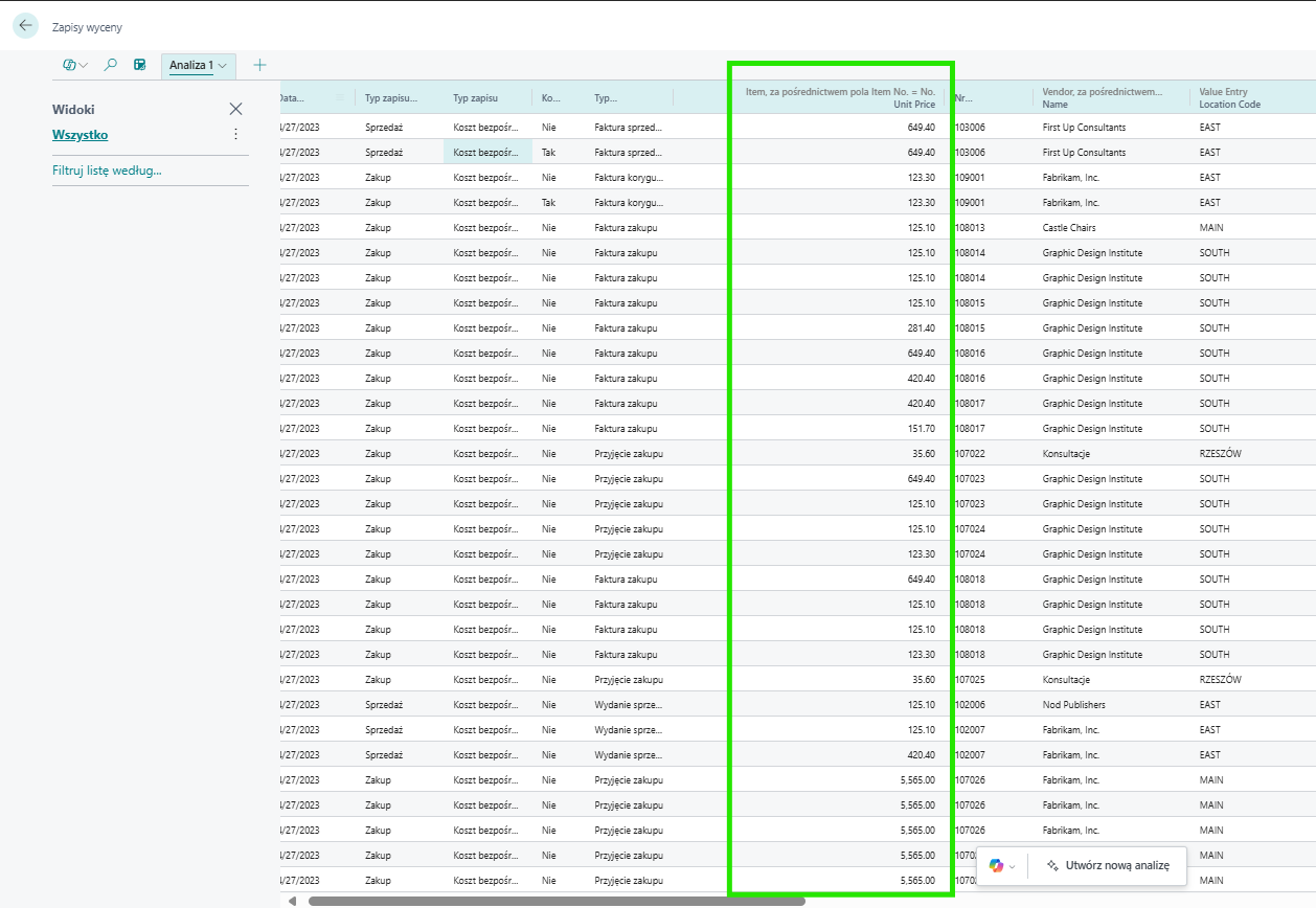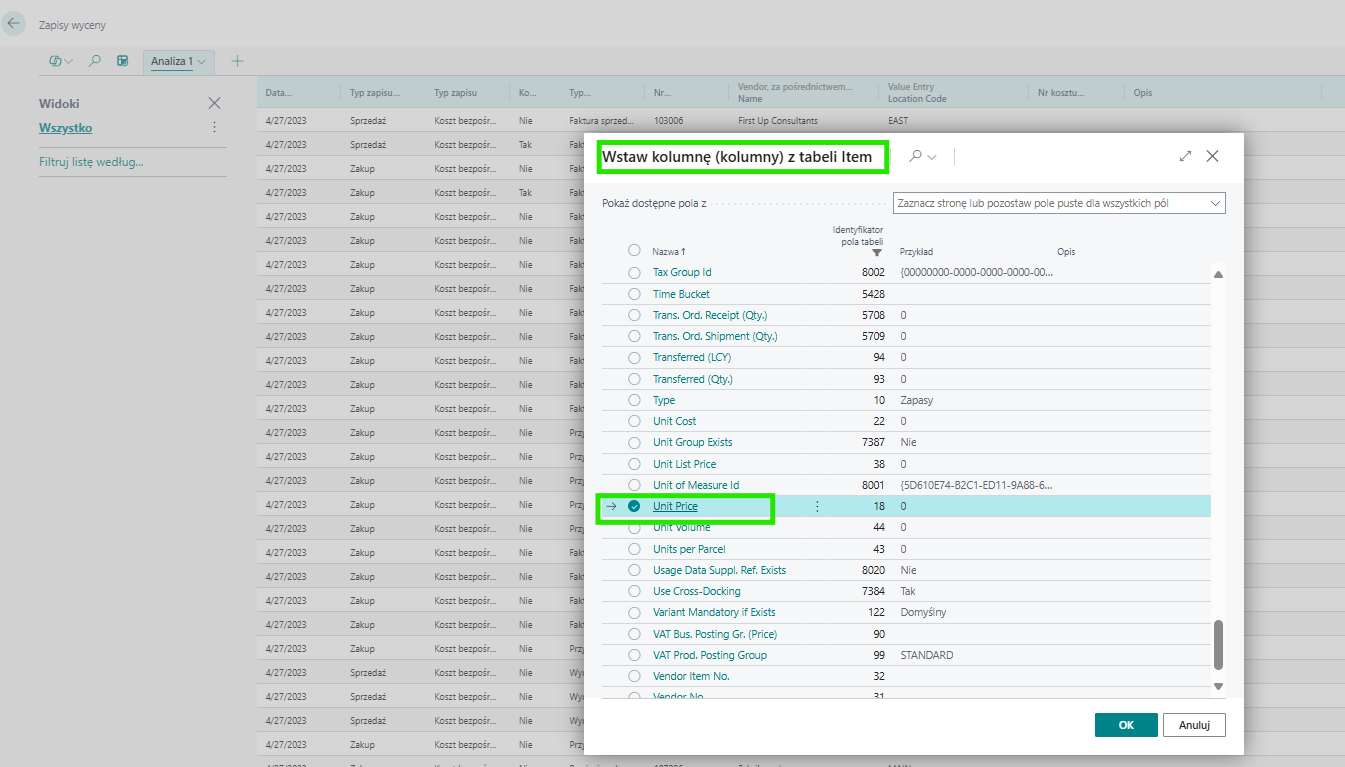 Dodając pole za pośrednictwem tabeli Item (Zapasy), kolumna w widoku analizy pojawia się pod nazwą: „Item, za pośrednictwem pola Item No. = No. Unit Price”.