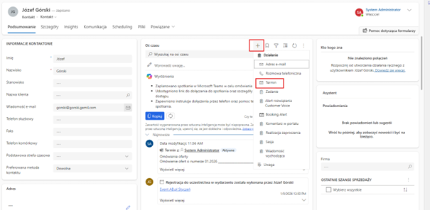 + Nowa aktywność → Spotkanie (Termin)