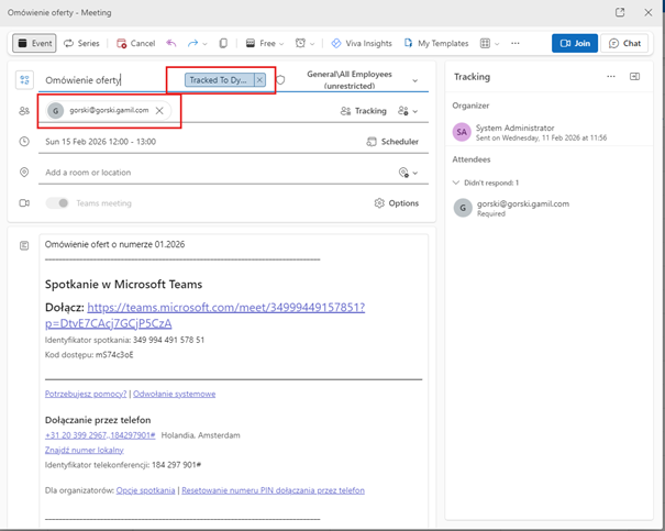 Integracja spotkań w Dynamics 365 z Outlookiem i Microsoft Teams jest funkcjonalnością dostępną w standardzie (Out of the Box). Nie wymaga dodatkowych modyfikacji ani customizacji – kluczowa jest jedynie poprawna konfiguracja środowiska oraz skrzynek użytkowników.