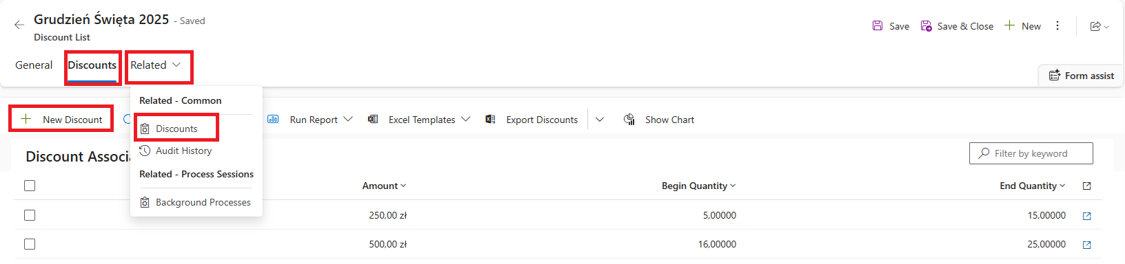 Lista rabatów potrzebuje korzystać z zakresów, którymi będzie się posługiwać. W tym celu należy stworzyć rekordy „Rabatów” i określić w nich widełki promocyjne. W tym celu z poziomu formularza listy rabatów, należy przejść do „Powiązane” i wybrać rabaty. Otworzy nam się grid utworzonych rabatów dla tej listy rabatów. Jeżeli żaden rabat nie istnieje, należy stworzyć rekord rabatu, wybierając przycisk „+Nowy Rabat”.