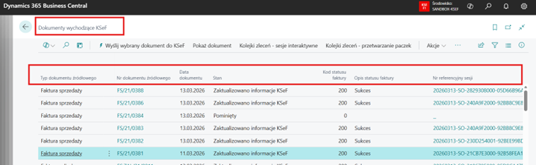 Po zaksięgowaniu, faktury automatycznie pojawiają się na stronie "Dokumenty wychodzące KSeF", gdzie widać m.in. status wysyłki, numery referencyjne i, po pozytywnej odpowiedzi systemu, numer dokumentu KSeF.