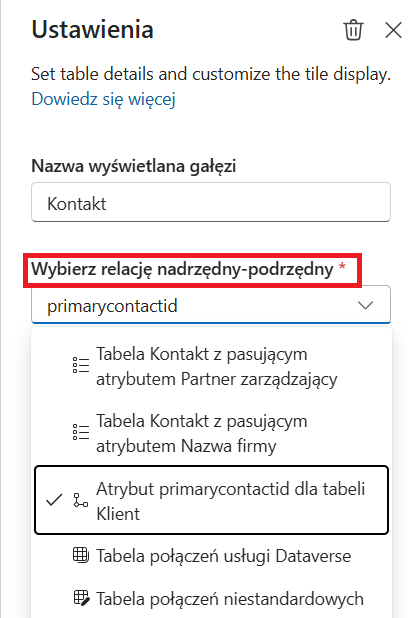 Aby dodać powiązanie jednoliniowe (np. aktywne i utracone szanse sprzedaży), należy użyć przycisku (+), który poszerzy widok drzewa hierarchii i pozwoli na dodawanie kilku encji podrzędnych w takiej samej linii. Wprowadzone zmiany należy zapisać i opublikować. Opublikowaną wizualizację można edytować, bez konieczności tworzenia kolejnej na nowo.